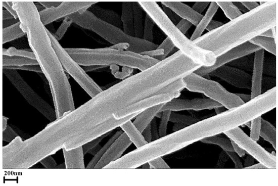 The SEM image of Figure 7 shows the morphological characteristics of the carbon nanofibers used in this work. The carbon nanofibers, as a consequence of the thermal treatment at 2500 °C, exhibit a rigid and straight structure due to the flattening of the CNF graphemic carbonaceous curved layers that have fused, giving rise to a minimum spacing between them. The same carbon nanofibers, when not subjected to high-temperature heat treatment, are characterized by a peculiar morphology called “Dixie Cup” [31]. In order to evaluate the level of dispersion of CNF inside the polymeric matrix both in the absence (EM + 0.5%CNF sample) and in the presence of the flame-retardant molecule GPOSS (EM + 5%G + 0.5%CNF sample), the morphological analysis was carried out by means of SEM.