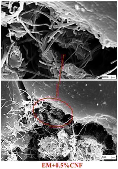 SEM images at different magnifications of the EM + 0.5%CNF sample.