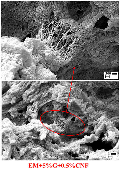 Pictures of the CNF, EM + 0.5%CNF, and EM + 5%G + 0.5%CNF were acquired using a Scanning Electron Microscope—SEM (mod. LEO 1525, Carl Zeiss SMT AG, Oberkochen, Germany). Thin slices were obtained by cutting the solid samples EM + 0.5%CNF and EM + 5%G + 0.5%CNF with a microtome. These slices, before being morphologically analyzed, underwent an oxidizing treatment with an etching solution [16,19] in order to remove the amorphous part constituted by the resin, thus allowing us to discover the carbon nanofibers and evaluate the state of dispersion of them within the epoxy matrix.