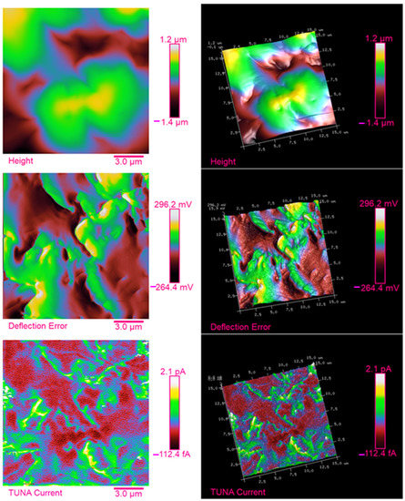 The multifunctional nanocomposite EM + 5%G + 0.5%CNF was subjected to morphological analysis by tunneling atomic force microscopy (TUNA-AFM) in order to evaluate the distribution of the conductive carbon nanofibers (CNF) inside the epoxy resin in the presence of GPOSS solubilized at molecular level. This technique permits a direct correlation of local topography with electrical properties of the nanofilled-based samples [16,19,32] measuring ultra-low currents ranging from 80 fA to 120 pA. In Figure 10, three different types of images, namely height, deflection error and TUNA current, both two-dimensional (2D) and three-dimensional (3D), are shown. They were captured simultaneously when a small tip is used to scan across the same area of the sample. These images allow the reader to have a clear view of the morphological characteristics observed in the light of the complementary information deriving from the three images that help to more easily detect the shape of the structure of the investigated sample. More specifically, the height image is essentially a topographic image shown as a map of pixels of different colors, where a colored bar associates color with height. This type of image allows us to estimate both lateral (X and Y) and vertical (Z) measurements. However, since such “height maps” do not always really resemble the object in question in shape, the topography image is further enhanced by adding the deflection signal to the surface structure. When operating in conditions of constant force, the deflection signal is also referred to as an error signal (“Deflection Error” image) since deflection is the feedback parameter; any characteristic or morphology that appears is due to the “error” in the feedback loop, or rather due to the feedback loop, which must intervene to keep the deflection setpoint constant. The TUNA current image is surprisingly interesting since it allows us to localize the conductive electrical domains at the nanometric scale and to identify the presence of conductive networks within the matrix in which the nanofiller is dispersed, also providing indications on the strength of the interfacial interactions between the nanofiller and the host matrix. From Figure 10, we can easily observe the carbon nanofibers, which constitute the conductive phase of the multifunctional nanocomposite, and which are well dispersed within the polymeric matrix thanks also to the presence of GPOSS, which allows us to reduce the viscosity of the nano-loaded system. All the TUNA images, but in particular the TUNA current pictures, allow us to discriminate a highly cross-linked conductive network that is highlighted by bright and intense colors ranging from light blue to yellow, which are associated with the scale bar shown on the right of the image. For this conductive network that extends along the entire investigated sample surface, local current values ranging from −112.4 fA to 2.1 pA are recorded, which satisfactorily justify the conductive behavior of the nanocomposite EM + 5%G + 0.5%CNF, whose electrical conductivity is 1.35 × 10−1 S/m. This electrical conductivity value is higher than that recorded by the EM + 0.5%CNF sample loaded with the same percentage of carbon nanofibers but without the GPOSS, which is equal to 5.84 × 10−2 S/m. For the unfilled epoxy formulation EM, as expected, a value of 8.17 × 10−14 S/m was instead recorded, thus confirming its insulating behavior. The action of GPOSS, as a viscosity modulator, results in a better dispersion of the carbon nanofibers within the insulating polymeric matrix with which they are strongly interconnected, forming a conductive nanometric network. In this regard, it is important to underline that the flow current due to the tunneling effect passing along the carbon nanofibers guarantees an effective transfer of the electrical properties to the insulating matrix thanks to the cross-linked conductive structure. In fact, on the whole investigated sample surface, it was possible to record current values as shown by the scale bar observable to the right of the TUNA image. Nanodomains characterized by higher current values are highlighted by the lighter pink-fuchsia colors of the scale bar.