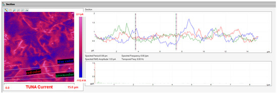 In order to estimate the CNF dispersion in the resin, Figure 11 shows the shape of the current changes visible in green, red and blue colors (see on the right) associated with the three white lines in the TUNA current image (see on the left) of the EM + 5%G + 0.5%CNF sample. We can see a good distribution of the carbon nanofibers within the host matrix. This can be deduced from the fact that the frequency of the changes due to filler/matrix interchanges along the three lines is quite constant, even if we can observe some areas of the sample where the current variations seem greater in correspondence with more conductive electricity.