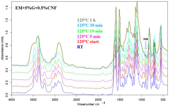 Spectroscopic analysis of the EM + 5%G + 0.5%CNF sample at room temperature and up to 125 °C for different times.