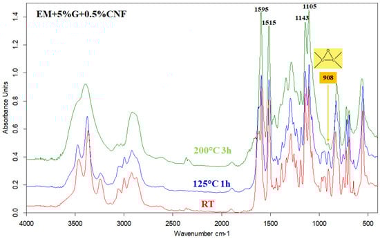 Using FTIR spectroscopy, we carried out an analysis of the curing behavior of the multifunctional nanocomposite through the variation in the band intensity of the functional groups, first at room temperature (before the curing treatment) and then at the two highest temperatures of 125 °C and up to 200 °C, which correspond to the temperatures programmed for the curing cycle of the investigated samples. In Figure 12, where spectroscopic analysis of the EM + 5%G + 0.5%CNF sample at room temperature and up to 125 °C for different times is reported, and in Figure 13, where the comparison between FTIR curves of the EM + 5%G + 0.5%CNF sample before curing (RT) and after curing (125 °C 1 h and 200 °C 3 h) is shown, the characteristic absorption peak of epoxide group at 908 cm−1 is highlighted in order to observe its evolution during the polymerization reaction of the multifunctional nanocomposite.