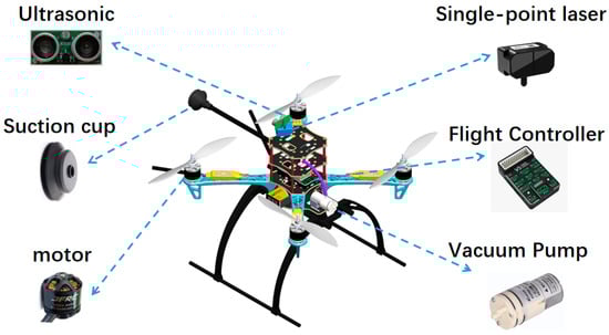 As shown in Figure 1, the flying and adhesion robot mainly contains the flight controller, suction cup, laser module, ultrasonic module, vacuum pump, motors, support bar, propellers and other parts. Among them, the suction cup and vacuum pump constitute the vacuum negative-pressure module. The laser and ultrasonic modules constitute the approach-heading measurement system.