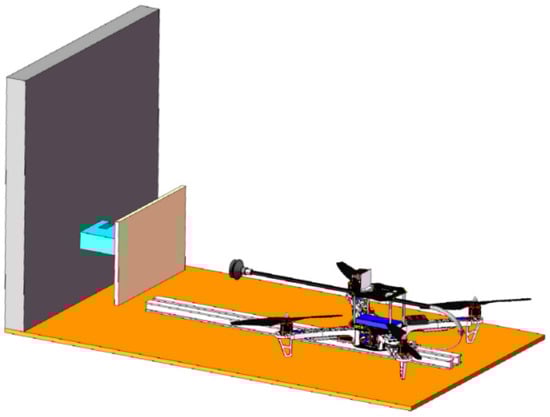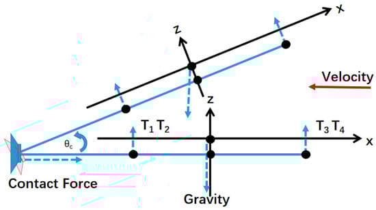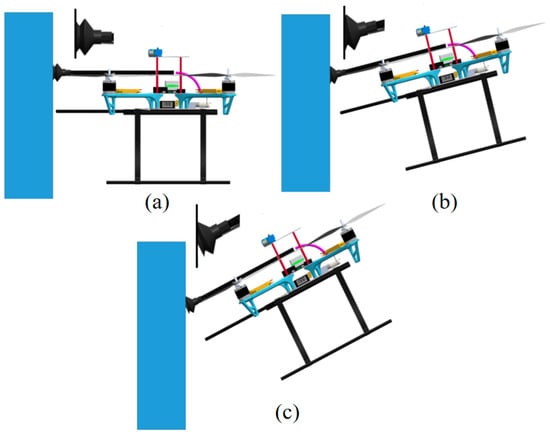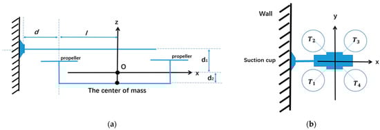 By Equation (6), assuming that is constant for a short period (the rotor cannot change pitch and reversal; the rotational speed cannot change instantaneously), at this time with the increasing, the rotational moment becomes larger and the angular velocity increases further, and eventually overturns. In addition, the near-surface effect may occur in this process [], resulting in an increase in rotor lift near the wall side, which exacerbates the overturning process. For these reasons, the horizontal-approach adsorption () is used in this paper, and the suction cups are placed upward to avoid overturning due to the approach velocity.