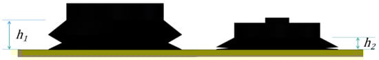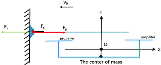As shown in Figure 2, the geometric center of four motors of the flying and adhesion robot is taken as the origin of the body coordinate system, and the direction of the angle bisector of the third and fourth motors is taken as the x-axis, the direction of the angle bisector of the second and third motors is taken as the y-axis, and the vertical direction is taken as the z-axis. is the x-axis distance from the end of the suction cup to the center of the body coordinate system. is the x-axis distance from the motor to the center of the mass. As shown in Figure 3, the height of the suction cup in the natural state is , and the height in compressed state is .