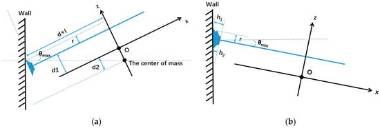 In order to generate force when the robot contacts with the wall, it is necessary to adjust the attitude of the body. If the pitch angle is too large, it will easily cause the body to overturn and lead to adsorption failure, while too small an attitude angle is not able to generate a negative-pressure environment. Therefore, it is necessary to analyze the angle range at the time of contact, as shown in Figure 6. The position of the suction cup center point under the body coordinate system is ; the position of the center of mass under the body coordinate system is , and the suction cup radius is . Assuming that the approach velocity is approximately equal to 0, the maximum acceptable contact angle is shown in the following equation: