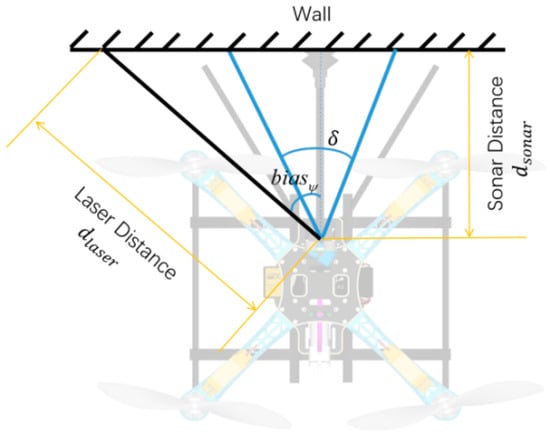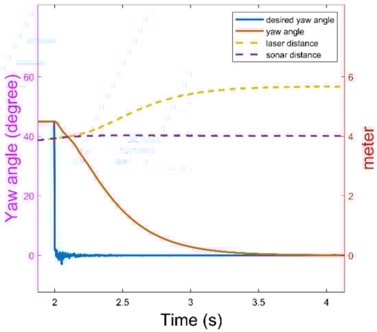 As shown in Figure 12, the robot takes off and then adjusts the heading angle within 2 s to 4 s based on the feedback ultrasonic and single-point-laser distance data. The desired yaw angle is calculated by Equation (23).