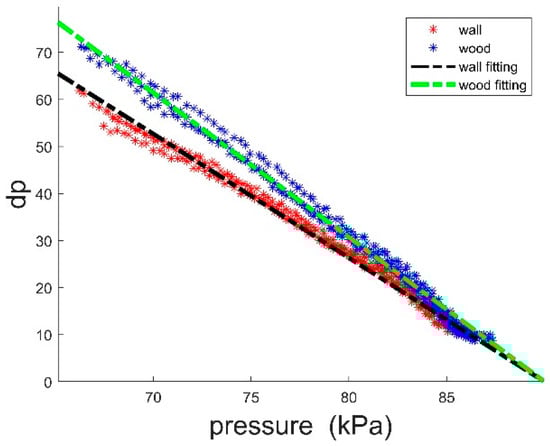 According to paper [], the expression for the leakage is Equation (17); however, it has too many factors and parameters such as the diameter of the leakage holes which are difficult to measure. According to the paper [], the leakage curve of the painted wall can be obtained by fitting Equation (18), and the specific parameters are measured later in the calibration experiment.