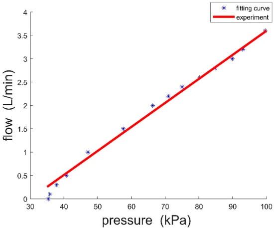 In order to determine the working characteristics of the vacuum pump, we need to measure its flow curve under different air-pressure conditions and fit the equation. We measure the flow under different air pressures by adjusting the flow meter and throttle valve. As shown in Figure 10, it can be obtained by fitting.
