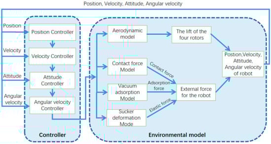 The dynamics model of the flying and adhesion robot is shown in Equations (1)–(3) below, where is the lift force generated by the corresponding motor, is the propeller speed, and is the propeller lift coefficient. is the air density. is the rotor disk area. R is the radius of the propeller blade. is the suction cup mass. is the total mass of the robot except for the suction cups.