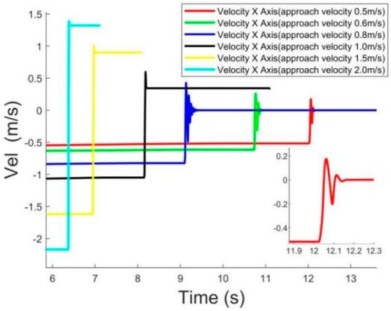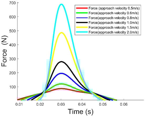 By giving different approach velocities without the vacuum pump, the robot generates different collision forces. As can be seen in Figure 16, the greater the approach velocity is, the greater the resulting collision force is.