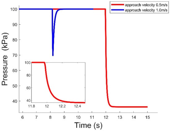 If the pressure inside the suction cup does not decrease after the contact between the suction cup and the wall, the robot detects that the adsorption process has failed and sends the desired velocity −2 m/s to disengage from the wall and prevents the robot from overturning.