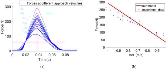 We validated the two-stage collision model by multiple collision experiments. As can be seen in Figure 20a, we adjusted the peak of the collision force to the same time. At this point, the collision-force curves intersect at a point roughly 60 N, which is the peak of the suction-cup elastic force we measured. The relationship between the peak contact force and the approach velocity is shown in Figure 20b. It can be seen that our model in the simulation is consistent with the experiment.