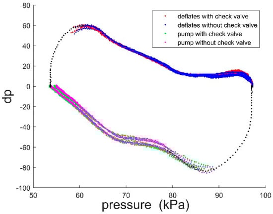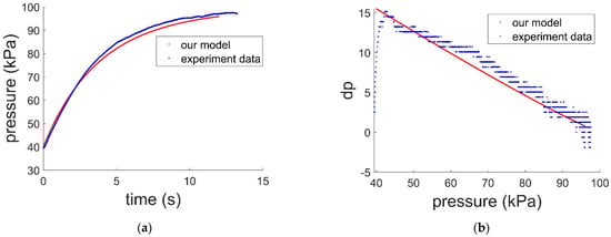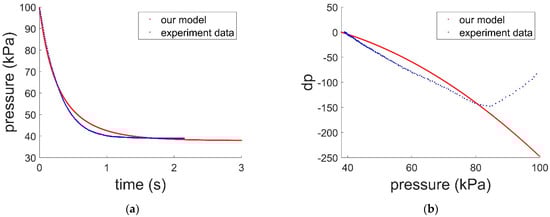 As in Figure 21 and Figure 22, the adsorption and leakage experiments with the actual suction cup and vacuum pump show that the model curve and the actual experimental curve are consistent. The left side shows the change curve of air pressure in the suction cup with time, and the right side shows the change curve of the air-pressure change rate with air pressure. It verifies the correctness of our model of the vacuum pump and air pressure leakage inside the suction cup.