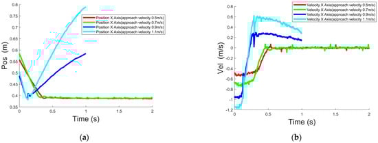 After 5 s, the flying and adhesion robot is given a desired x-direction desired velocity for approach adsorption, and the vacuum pump is turned on to generate negative pressure within the suction cup after contacting with the wall. The position, velocity, and contact force are simulated during this process. As shown in Figure 13, Figure 14 and Figure 15, the curves of position, velocity, collision force with time after the horizontal collision between the robot and the painted wall from the initial approach have a velocity of 0.5 m/s to 2 m/s. The simulation terminates after the robot moves to 1m from the wall (position x = −2 m).