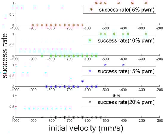 We conducted collision-adsorption experiments by adjusting the duty cycle of the vacuum pump. The flow rate of the vacuum pump under different duty cycles was not consistent. The lower the duty cycle was, the higher the pumping speed of the vacuum pump was. As can be seen in Figure 24, the lower the flow rate is, the smaller the dividing line of approach velocity between successful and failed adsorption is.