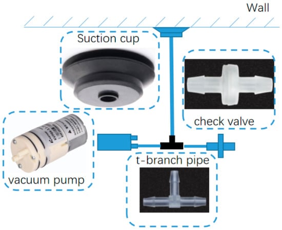 Robots based on adsorption methods such as negative pressure are mainly found in special robots such as wall-climbing robots. In the papers [,,], suction-cup modeling is performed, and the effective area, adsorption force and friction force are calculated. Moreover, flight adsorption can be achieved through control and planning. In Paper [], control and planning algorithms are used to enable an underdriven quadrotor with a downward gripper to stay on an inclined surface while satisfying the drive and sensing constraints.