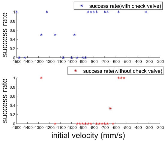 As shown in Figure 27, the effect of the check valve on the approach velocity is tested at different velocities in the ground-collision experiment. It can be seen that using the check valve can increase the maximum value of the approach velocity from 600 mm/s to 850 mm/s. In the presence of a check valve, when overpressure is generated in the case of high approach velocity, the gas inside can be discharged quickly, which is conducive to the establishment of a negative-pressure environment, but the success rate cannot be guaranteed.