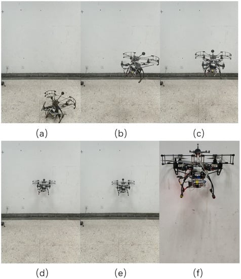 Figure 29 illustrates the complete adsorption process of the flying and adhesion robot. Figure 29a: The robot takes off on the ground; Figure 29b: The robot flies to a specified position and starts to adjust the heading angle to face the wall; Figure 29c: The robot flies towards the wall at a specified approach velocity; Figure 29d: The robot makes contact with the wall and the vacuum pump works; Figure 29e: The rotors stop working and the robot completes the adsorption process; Figure 29f is a magnified view of the robot perching on the wall.