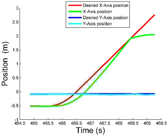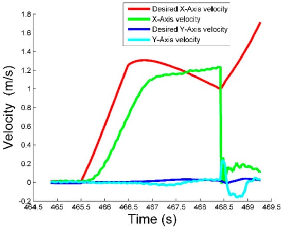 As shown in Figure 30 and Figure 31, the robot took off from position (−0.5, 0), moved toward the target point with a target velocity of 1.2 m/s, and finally stopped at position (2, 0) by approach adsorption. At this point, the velocity jumped to 0 m/s, producing an acceleration greater than 60 m/s2, as shown in Figure 32.
