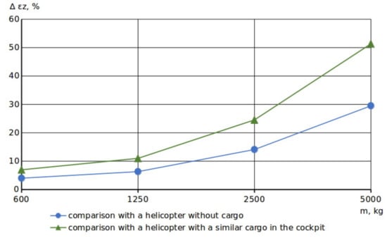 Figure 2 and Figure 3 show the dependence of the increment of the angular acceleration of the Mi-8MTV helicopter with an external sling on the cargo mass in comparison with the option of placing a cargo of the same mass inside the cargo compartment and in comparison with a helicopter without cargo with an instantaneous movement of the cyclic pitch handle by 50 mm from the neutral position, respectively, in pitch and roll.