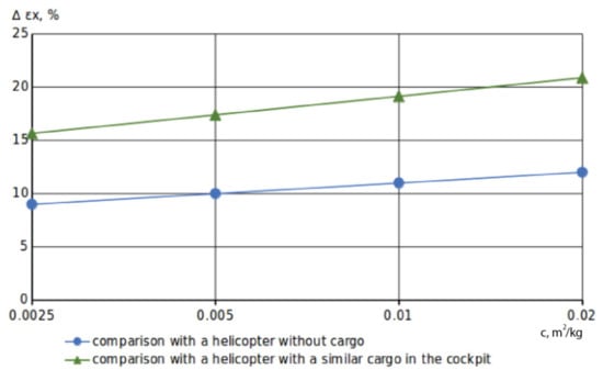 Figure 4 and Figure 5 show the dependence of the increment of the angular acceleration of the Mi-8MTV helicopter with an external sling on the ballistic coefficient of the cargo in comparison with the option of placing the cargo of the same mass inside the cargo compartment and in comparison with a helicopter without cargo with an instantaneous movement of the cyclic pitch handle by 50 mm from the neutral position, respectively, in pitch and roll.
