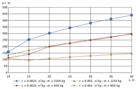 The effect of ES cable length L on the transient time t is clear at certain combinations of mass m and ballistic coefficient of the cargo с. The values of the transient time increment t with HES, expressed as a percentage of the transient time without HES, depending on the cable length, are shown in Figure 6. Computational experiments were conducted in which the virtual pilot was tasked with accelerating from a steady-state horizontal flight with no oscillations of the helicopter or cargo to build these graphs. From 40 km/h to 100 km/h, and braking from a steady horizontal flight from 100 km/h to 40 km/h. Based on the results of the experiment, the transient time was determined, and we found its average value for acceleration and deceleration for the cargo parameters and cable length.