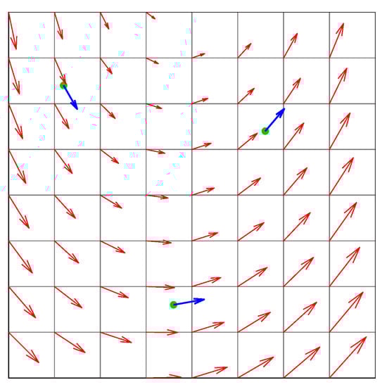 We thus wish to find the vector field described by a linear equation  that is best fitted to our observations. To illustrate this aspect, we construct a grid over the airspace (see Figure 2) on which we carry out a regression of a vector field that minimizes the error between the model and the observations. In order to use matrix forms, we rewrite Equation (1) as , introducing the following matrices: