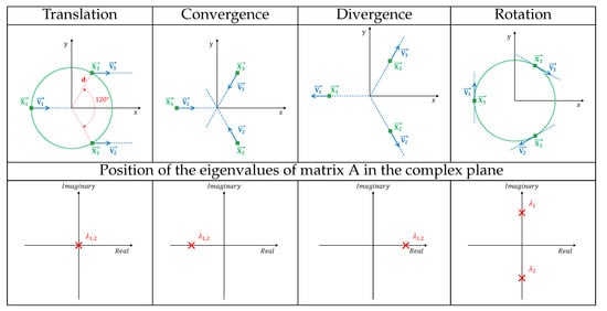 As an example (see Figure 4), the eigenvalues of matrix  have been calculated for a situation with three aircraft located on a circumference, for which only the orientation of the speed vectors is modified in order to create four traffic situations (pure translation, convergence, divergence and pure rotation). As we can see in Figure 4, the pure translation and pure rotation are the two organized traffic situations, as they have eigenvalues in the central band of the complex plane.