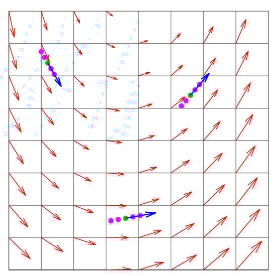 Looking at Figure 4, the small squares are the initial positions of aircraft at a given time (this represents the observation given by radar, for instance, with the associated speed vector). As can be observed, the aircraft are initially located on a circumference with a diameter of . The positions of aircraft two and three are symmetric to the x-axis. All the speed norms are the same and have been fixed at . The vector field associated with each one of these four situations is shown in Figure 5.