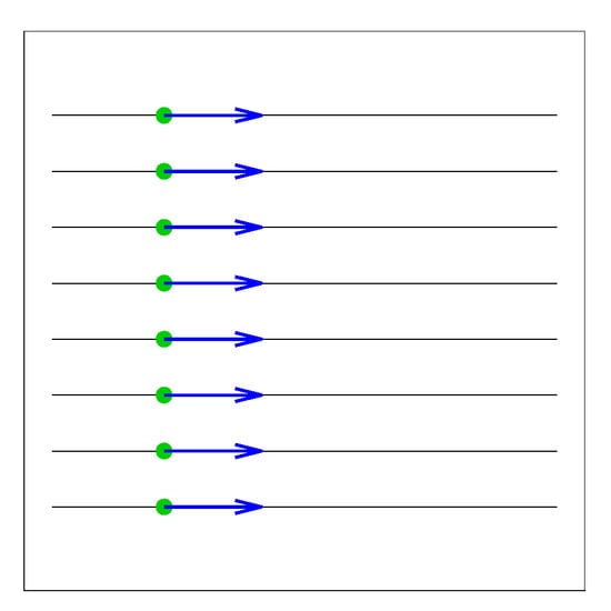 Different traffic samples have been created in order to compare the complexity metric previously described. For the following toy examples, no uncertainties are considered and every aircraft is flying at the same flight level. Six traffic situations will be classed according to an increasing level of difficulty (increasing order of complexity) as a function of predictability and interdependency between trajectories. The full trajectories of aircraft are shown in the following figures, where a green circle symbolizes their initial positions. Figure 12 shows a parallel flow of aircraft. It represents an easy situation, where aircraft relative distances stay the same. This situation has no complexity (null  matrix; see Equation (7)).