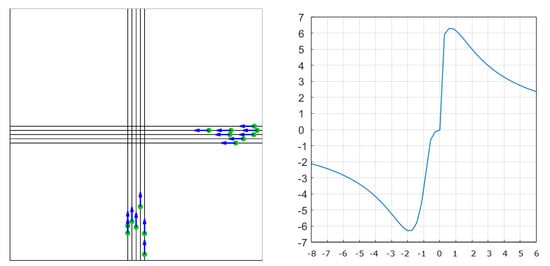 Figure 13a shows a full symmetric convergence of eight aircraft flying at the same speed. It represents an average situation with high sensitivity and conflicts with no interaction between solutions. In order to build an aggregated metric along the time dimension, we compute for each time sample the associated eigenvalues of the  matrix, for which the real parts are summed up in order to produce a scalar value (Figure 13b). It must be noticed that the metric begins to be negative, demonstrating that the situation is globally converging. Suppose we continue evaluating that situation over time. After the crossing of the aircraft, the metric becomes positive, and the situation is globally diverging.