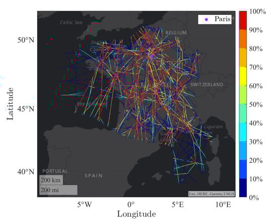 This complexity metric has been computed on traffic simulated with real flight plans of aircraft crossing the French airspace (as a matter of fact, using real traffic data, such as radar tracking records, is meaningless because such traffic has been managed by the controller and complexity has been removed). Based on such flight plans, an arithmetic simulator based on the BADA database has been used in order to create 8000 four-dimensional trajectories in the French airspace. The trajectory has then been sampled every 20 s, representing two million 4D points for the whole day. The metric has been computed for each trajectory and for each time step in a 4D cube (three spatial dimensions and one time dimension) and projected on a two-dimensional coordinate system to have a complexity map, as shown in Figure 17. On this figure, the metric has been normalized between 0 (blue color) and 100% (maximum with red color). As expected, the highest complexity is located near the big crossings. One must remember that the map represents the accumulated complexity in altitude and time. A 2D point at (x,y) on the map represents all 4D points at those 2D coordinates (x,y).