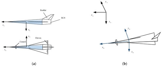 As shown in Figure 2a, the studied NSHV has delta wings, foldable horizontal canards, a vertical tail, and the RCS. Due to the low atmospheric density, the aerodynamic rudder surface efficiency is insufficient, which makes it difficult to meet the control requirements. Therefore, RCS is adopted to complete attitude control.