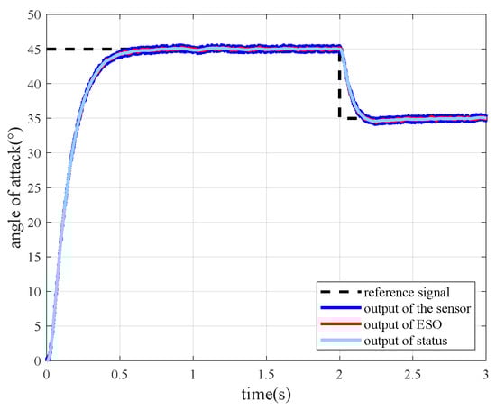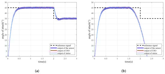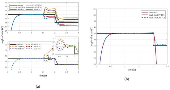 As the Figure 12b illustrates, under the stuck fault, the output of ESO is used as feedback to achieve security control to some extent. Compared with the PFTC strategy, the AFTC strategy has a stronger fault tolerant ability to the stuck fault. Command tracking can be maintained after the fault occurs, although it slowly diverges.