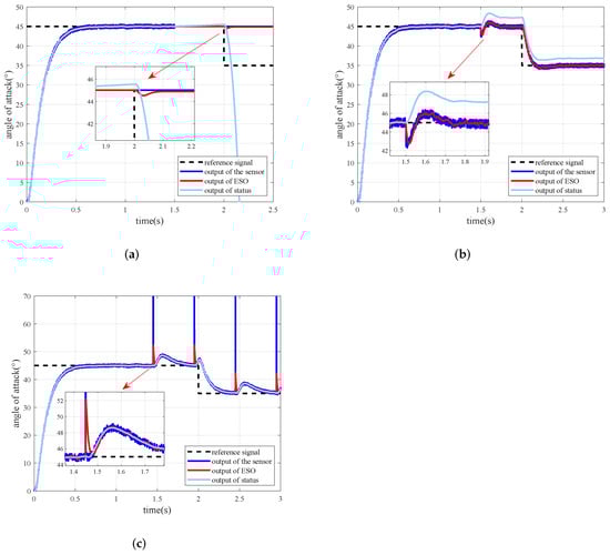 (a) Angle of attack under the stuck fault; (b) angle of attack under the gain variation fault; (c) angle of attack under the outlier data fault (the maximum outputs of the outlier data are ).