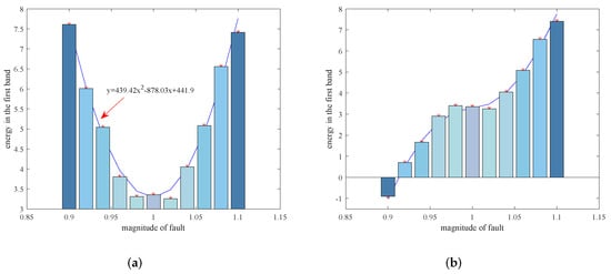 Furthermore, in terms of AFTC, it is necessary to know not only types of sensor faults but also sizes of faults. Energy in the low-frequency bands reflects sizes of the sensor fault. Under gain variation faults, as shown in Figure 11a, there is a quadratic correlation between the energy in the first band and gains, and the coefficients are calculated by LSM.