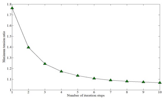 Figure 3 shows the maximum tension ratio of the cable in the iteration steps, with the ratio approaching 1. That is, the cable tension is uniform on the mesh reflector of the antenna. However, the precision of the antenna mesh reflector was seriously affected by the iterative FDM, and therefore, precision was not expected during the form-finding process.