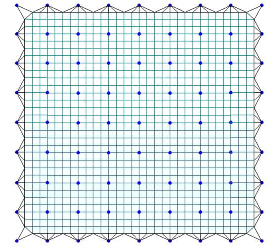Figure 4 shows the configuration of an antenna mesh reflector. The black line represents the boundary segment and the iterative form of the force density coefficient of Equation (8) is adopted in the iterative process. The inner cables are represented by dark cyan lines and the iterative format of the original force density coefficient, Equation (7), is adopted in the iterative process. The blue points represent the fixed-point positions. Considering that the net precision of the internal cables affected the pointing accuracy of the antenna mesh reflector, it can be used as the convergence index of the algorithm. The internal point configuration error is
