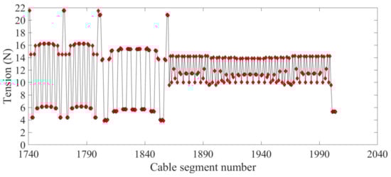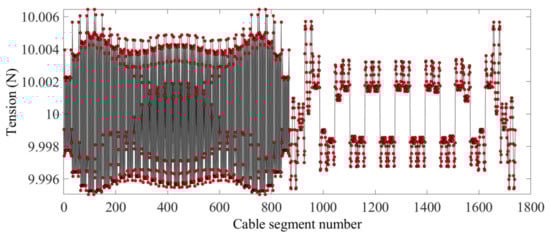 According to the results shown in Figure 5, the form-finding process based on the HIFDM has a potential shape-preserving effect between the boundary cables and the inner cables. In addition, the position of the interconnecting points of the cables does not change from before to after the form-finding. The internal cable segment tension is shown in Figure 6. According to the figure, the value of the internal cable tension is very close to 10 N, so the internal cable tension is uniform. Figure 7 shows the tension value of the boundary cable segments. The HIFDM ensures the position of the interconnecting points of the boundary cable, and the maximum tension ratio is 4.8445.
