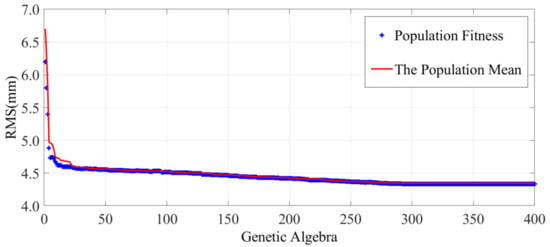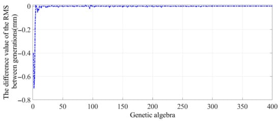 This study adopted an adaptive GA proposed by Lin. The population size was set to 50 and the genetic algebra to 400. Based on the above optimization steps, the final form-finding result is shown in Figure 10. The RMS of the internal mesh reflector decreased from 6.6 mm to 4.3 mm with the accuracy improved by 34.8%. Figure 11 shows the RMS difference value between the two generations of the population, indicating the population convergence starting from generation 282 and the optimal solution.