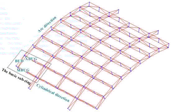 The deployable structure is shown in Figure 15. Three different kinds of sub-elements, the basic unit on the directrix (BUD), the MBUG (main basic unit on the generatrix (MBUG), and the assistant basic unit on the generatrix (ABUG) make up the basic sub-ring.