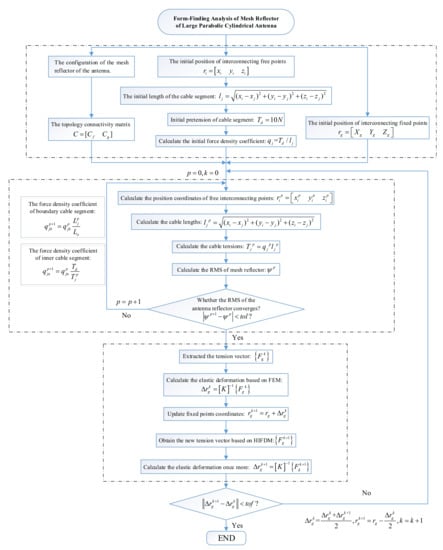First, the design parameters and physical parameters of the deployable parabolic cylinder antenna were given, and the FEM model of the deployable structure was given based on the construction process introduced in Section 4.1. Then, the configuration of the mesh reflector of the antenna was given and the topology connectivity matrix C was obtained. According to the given initial pretension of the cable segment and the initial position of interconnecting free points , we calculated the initial length of the cable segment  to obtain the initial force density coefficient  of each cable segment. Then, based on the HIFDM proposed in this paper, the force density coefficient when the RMS of the inner mesh reflector converges was obtained (convergence indicator ) and the tension of each cable segment after form-finding could be solved. Finally, we extracted the tension vector  of connecting points between the cable and deployable structure, which we introduced into the FEM model to calculate the elastic deformation . The updated point positions were substituted into the HIFDM to obtain the new tension vector  and the elastic deformation  was calculated once more. The error of two elastic deformities of the deployable structure were compared; that is, the change of the cable segment tension connected with fixed points after elastic deformation of the deployable structure was considered, and, according to the convergence index (convergence indicator tof = 1 mm), whether to proceed to the next iteration was determined.