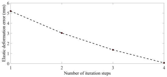Figure 19 and Figure 20 show the tension of the inner cable segments and the boundary cable segments, respectively, while the maximum tension ratios were 1.0372 and 5.5898. Figure 21 shows that after four iterations, the error of elastic deformation of the deployable structure was less than 1 mm, and the algorithm converged. The results show that the elastic deformation of the deployable structure affected the uniformity of the cable tension of the mesh reflector.