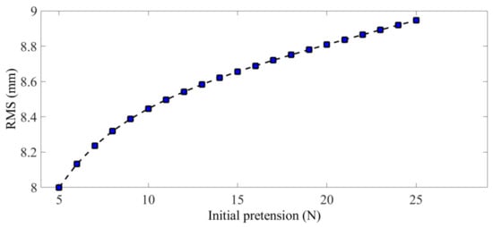 Figure 22 shows the variation trend of the mesh reflector accuracy of the antenna under different pretension after considering elastic deformation of the deployable structure. It can be seen from the figure that with the increase of pretension, the elastic deformation of the deployable structure had an increasing influence on the precision of the mesh reflector. Therefore, the reasonable design of pretension has far-reaching consequences for the precision of the antenna mesh reflector.