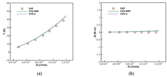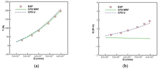Comparison between the experimental results and CFD results of the 400 ducted fan: (a) Total thrust, (b) total torque.