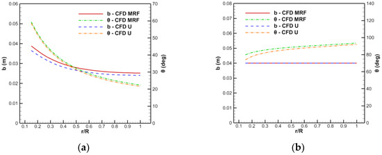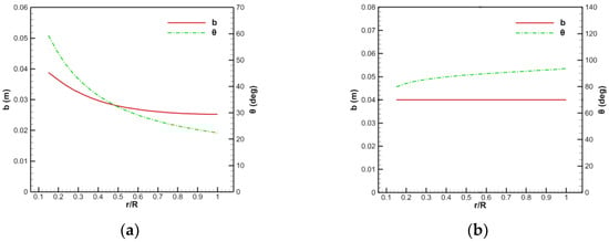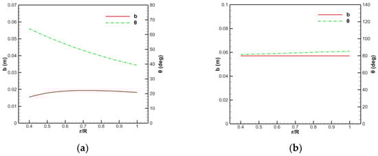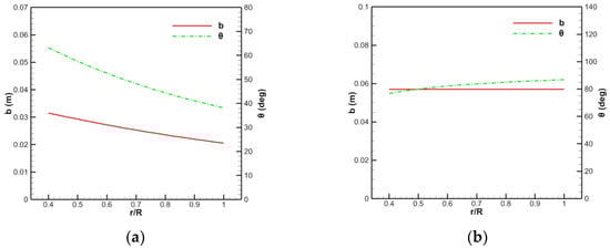 Results of the chord length and torsion angle of the blade of the 400 ducted fan: (a) Rotor, (b) stator.