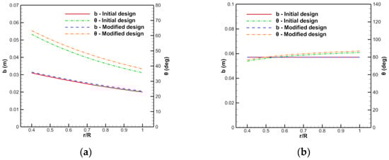 Comparison of the chord length and torsion angle of the blade of the 400 ducted fan: (a) Rotor, (b) stator.
