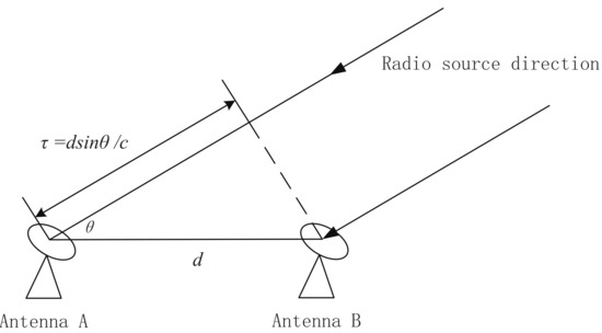 The times for the electromagnetic waves radiated by the radio source to reach different VLBI observation stations at a certain moment are different. Take the VLBI system of two base stations as the project. Under ideal conditions, the signals and detected by the two base stations should be completely consistent, except for the time delay . However, due to various interferences, the delay value that minimizes the variance of the two signals in actual processing is the required delay value, as shown in (1):